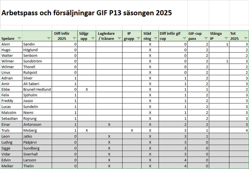 Jag har dessutom sammanställt arbetspassen från i år. Dessa kommer tas med till nästa år så att det ska bli någorlunda rättvist. Det blir ingen milimeterrättvisa, jag vet mycket väl att vissa pass är mer betungande än andra men vi får alla försöka ställa upp. Säg till om ni tycker att jag har glömt något som ska vara med.